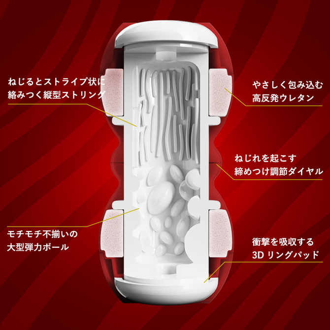 本体の上下を持って回すだけで内部の樹脂に捻れを発生させ、締めつけが調節可能なメンズマックススマートの新提案!締めつけレベルは超ソフトなLv.1から極狭のLv.6までの6段階がお楽しみいただけます。内部構造は大型弾力ボールとねじれば絡みつく縦型ストリング。スマートギア初期モデルにふさわしい王道の構造。上下に挿入口が施されていますので二つの挿入感を楽しめるのが特徴です。本体サイズ:16.3×8cm重量:242g