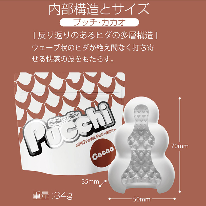 ローションいらずのオナホール!プラスウェッチは独特開発の新素材。なんと水だけでねっとり潤う魔法のようなオナホール。水をつけて軽く擦ることで、内部に超ミクロサイズで閉じ込められた「潤いゼリー」が水に反応し、沁みだし、樹脂表面をねっとりと潤い包み込みます。12種類ありますので、好みの感触を探してみて♪「Cacao(カカオ)」はビッシリ並んだヒダが反発しながら複雑に絡みつく刺激。パッケージサイズ:14×12.8.×5.5cm重量:34g本体サイズ:7×5cm