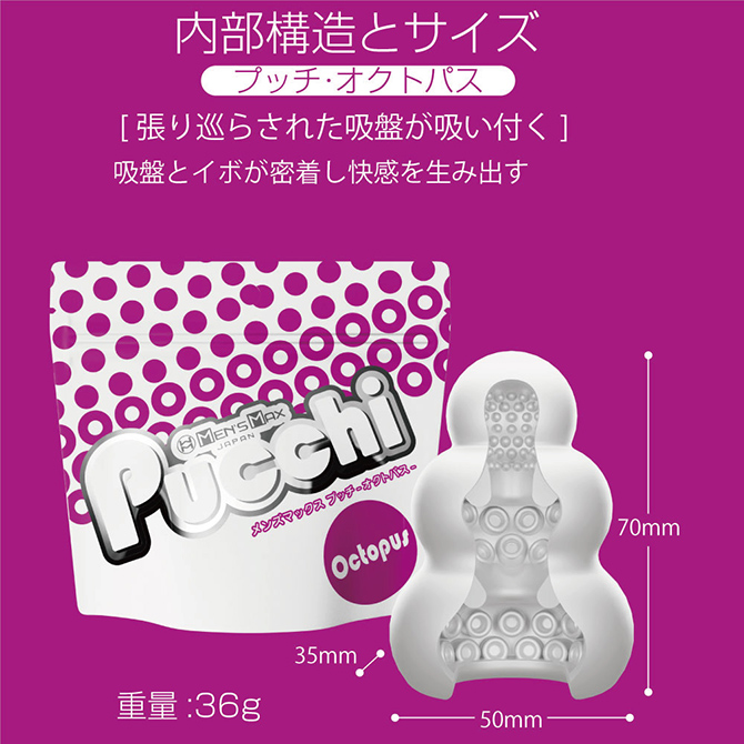 ローションいらずのオナホール!プラスウェッチは独特開発の新素材。なんと水だけでねっとり潤う魔法のようなオナホール。水をつけて軽く擦ることで、内部に超ミクロサイズで閉じ込められた「潤いゼリー」が水に反応し、沁みだし、樹脂表面をねっとりと潤い包み込みます。12種類ありますので、好みの感触を探してみて♪「Octopus(オクトパス)」は吸引とイボが密着し快感を生み出す。パッケージサイズ:14×12.8.×5.5cm重量:36g本体サイズ:7×5cm