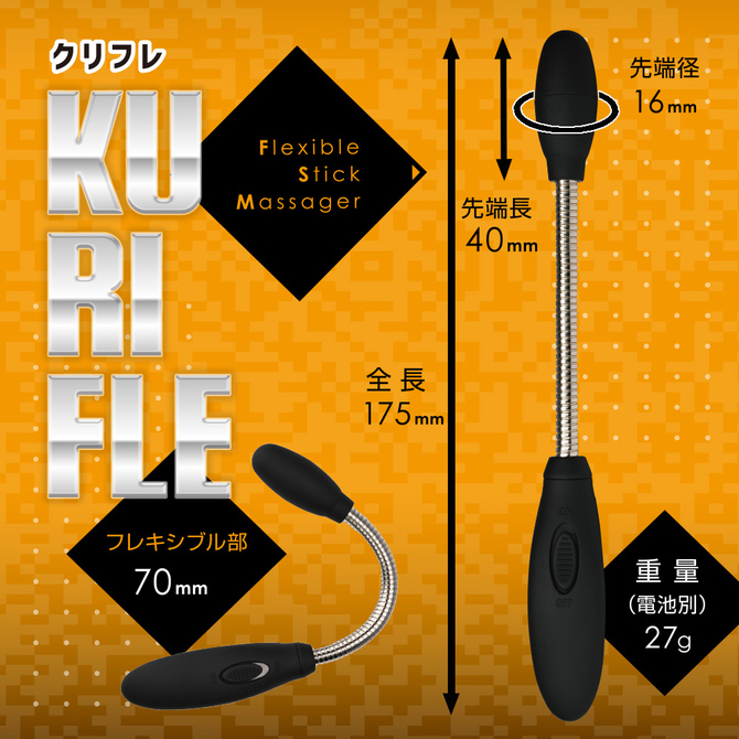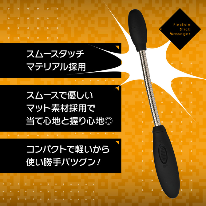 フレキシブルに曲がる70mmのネックでスタイリッシュに楽しめます。スムースで優しい素材だから当て心地も◎。コンパクトな形状と簡単操作で振動するスティックマッサージャーです。本体お色はブラックパッケージサイズ:5.2×19.5×2.4cm本体サイズ:1.6φ(最大径)×17.5cm内容量:75g付属品:単四電池1本