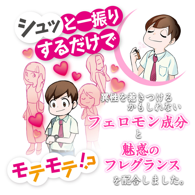 Hなフェロモンスプレー。異性を惹きつけるかもしれないフェロモン成分と魅惑のフレグランスを配合しました。これであっはんうっふん間違いなし!?注)本製品はジョークグッズです。パッケージサイズ:3×10.3×3cm本体サイズ:10.3×2.9cm内容量:30ml