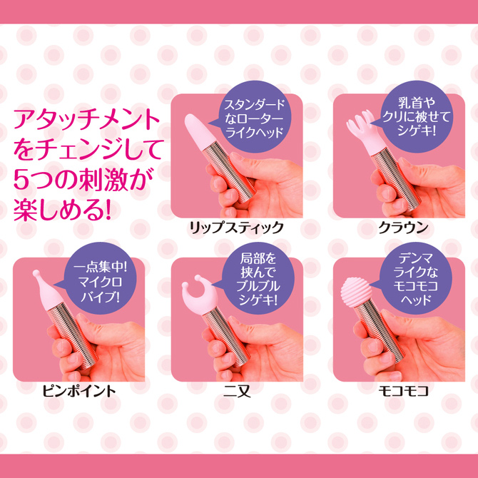 滑らかなシリコンヘッドアタッチメントは5種類。 ・ローターライクな使い方が楽しめるリップスティックタイプ ・乳首等を挟んで刺激出来るクラウンタイプ ・一点刺激が楽しめるピンポイントタイプ ・局部を挟んで刺激する二又タイプ ・デンマライクに楽しめるモコモコタイプ