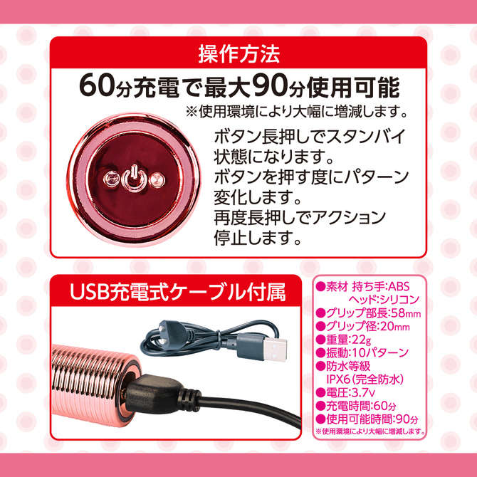 3.7Vのハイパワーリチャーブルバッテリー搭載。 60分充電で90分の使用が可能です。 (※使用環境により大幅に増減します) IPX6の防水性能だからしっかり洗えて水場でも遊べます。 本体の振動パターンは10種で色々な振動が楽しめます。