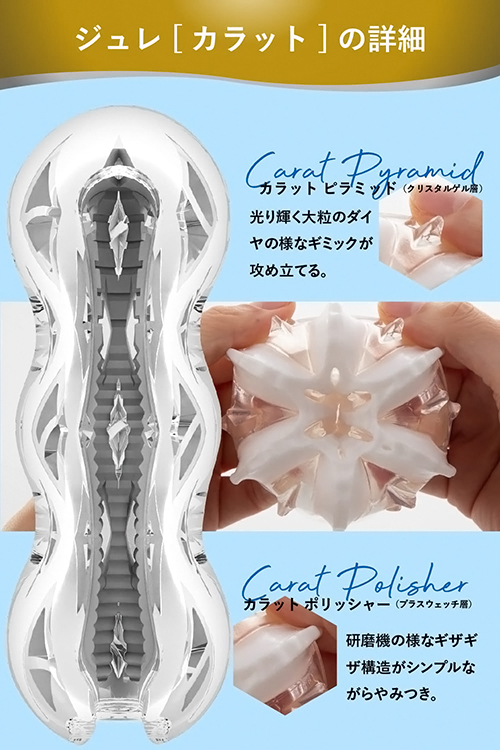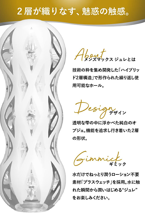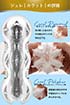 「ハイブリッド2層構造」で作られた繰り返し使えるホールです。 スパイラルタイプは長い突起が全体に絡みつく刺激です。 内部素材には水だけでねっとり潤うローション不要素材「プラスウェッチ」を採用。 水に触れた瞬間から潤いはじめます。 精巧な内部が見えるクリスタルボディの内側は、紐のように細長く飛び出した 全身に絡みつくストリングが特徴のクリスタルゲル層と、大小様々なブロック型の 構造が生む面と点の刺激が楽しいプラスウェッチ層が絡み合うハイブリッド刺激。 使用後は水・またはぬるま湯で洗い流して繰り返し使えます。 またケースがそのまま乾燥スタンドになるので保管も便利。 さらにホール表面のベタつきやホコリの付着などを抑えるポケットパウダーも付属しています。