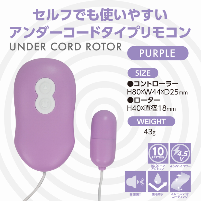 コードがコントローラーの下側から出ているのでセルフプレイの時も通常時もコードの煩わしさが軽減されたスタイリッシュデザインローター登場。単四電池3本を使用した4.5Vの強力振動マイクロモーター搭載の小径ローターに可愛いカラーバリエーション、さらにマット加工を施し、上質を極めた新型ローターです。10パターンアクション・ワンプッシュで簡単にON/OFF操作可能です。本体色:パープル【本体サイズ】コントローラーH80xW44xD25mm/ローターH40x直径18mm付属品:単四電池3本商品重量:105g