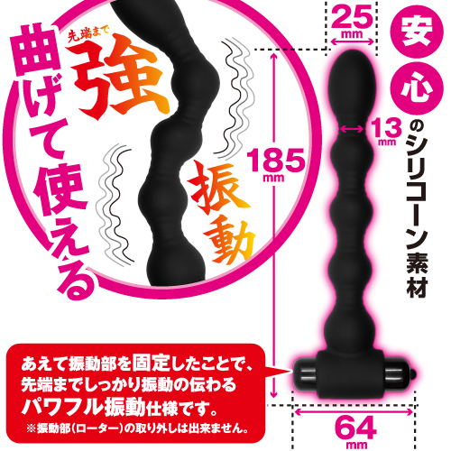 自由に曲げて使える強振動アナルローター!多彩な10振動パータンと程よい硬さのシリコンが小刻みにアナルを刺激します!あえて振動部を固定したことで先端までしっかり振動の伝わるパワフル振動仕様です!商品サイズ:全長18.5×最大径2.5cmパッケージサイズ:W8.5×H20×D6cm重量:83g単4アルカリ乾電池1本