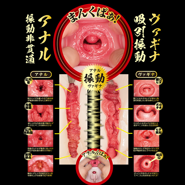 ヴァギナは振動+吸引!ぷっくり子宮口からギュンギュン吸い込む超吸い付きマンコ! ・膣口には大きなヒダが連なり亀頭を刺激しカリ首を締め上げる! ・Gスポットはポルチオ突起と大疣がペニスを挟んで圧迫快感! ・蓮輪状のヒダ突起をイボイボ突起が亀頭を包んでサオを圧迫! ・ぷっくり子宮ポルチオが吸引してペニスと性液を吸い付くす!