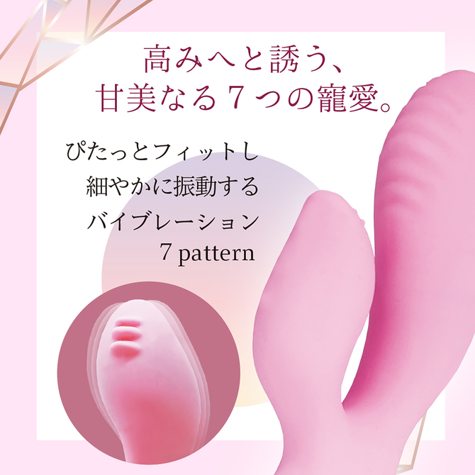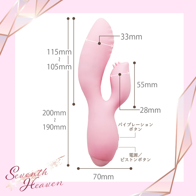 女性に寄り添う愛情バイブ「セブンスヘブン」 繊細なウエーブを施したヘッドが、Gスポットをキャッチし、7パターンの多彩なピストンで奥を丁寧に撫で上げます。 クリバイブには3枚の小さなベロがついており、7パターンの小刻みなテンポでじわじわと刺激。弾力性が良いため、クリを逃がさずしっかりフィットします。 シリコン製なので、すべすべでなめらかな触り心地。 USB充電式で、付属のコードがあれば場所を選ばず充電できます。 生活防水設計のため、お手入れもらくらく。 可愛らしい丸いフォルムの、優しさが溢れるバイブです。