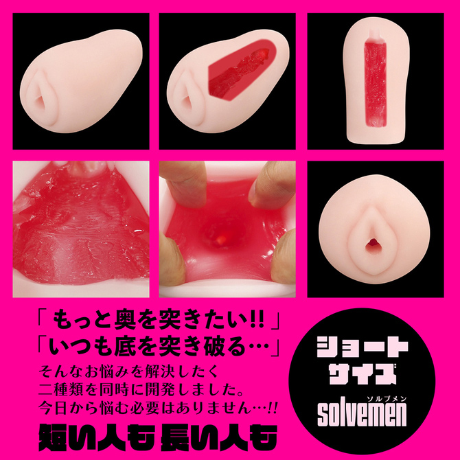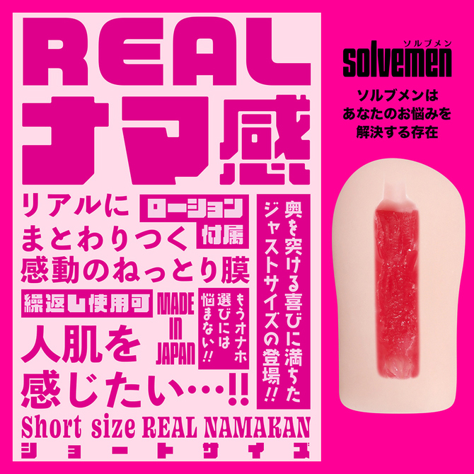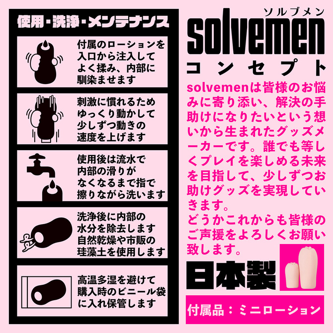 ソルブメンはあなたのお悩みを解決する存在です。「ショートサイズ REALナマ感」は短くても楽しめるお悩み解決ホール。奥に簡単に到達できるのが自慢です。人肌素材のリアル二層弾力で快感のバランス抜群に良く包み込みます。この喜びを知ったらもう普通のホールには戻れません。あなたはオナホ選びに悩む必要はなくなります。あなたのためにソルブメンがいるのです。安心安全の日本製で繰り返し何度でも利用が可能です。パッケージサイズ:縦13.7×横8.5×奥行5.5cm本体サイズ:縦10.5×横5.0×奥行5.0cm重量:本体220g付属品:ミニローション