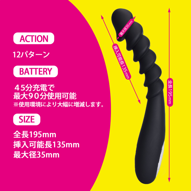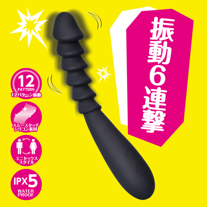 出し入れする度にポコポコ続く快感に振動がプラスされてより刺激的なプレイが実現。充電式のリチウムイオン電池は90分充電で45分使用可能。12パターンの振動を好みに合わせて楽しめます。素材は滑らかで肌触りの良いスムースマットシリコン素材採用。IPX5の防水性能で使用後はしっかり洗えて衛生的に遊んで頂けます。絶妙なソリ具合とサイズ感・柔らかさにこだわった特殊形状バイブスティックです。本体サイズ:全長19.5×挿入可能長13.5×最大径3.5cm重量:40g付属品:充電ケーブルパッケージサイズ:W6.5xH21+ヘッダー3xD3.5cm