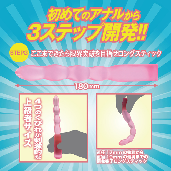 初めてのアナルから3ステップ開発用3本セット!!男女兼用ソフトな弾力素材を採用した日本製。STEP1全長150mm先端部の径10mmのつぶつぶスティック。STEP2全長170mm先端部の径13mmの拡張しつつ刺激も楽しめるらせん状スティック。STEP3全長180mm先端部の径16mmのパール風ロングスティック。パッケージサイズ:20.9×6.5×2.5cm本体サイズ:STEP1全長15.0cm STEP2全長17.0cm STEP3全長18.0cm