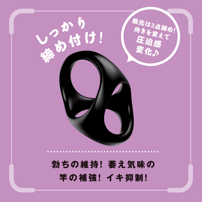 根元を3点で締め付け!タマタマを下から突き上げるようにしっかり締め付けてチカラを出す! サッと装着♪ピタッと密着!装着しやすい伸縮性、臭いのない高品質シリコンで根元をしっかり締め付け、着けてるストレスを軽減!すべすべ装着感で毛の巻き込みを緩和。向きを変えて圧迫感も変化♪ 自分好みの締め付けで勃ちの維持!萎え気味の竿の補強! イキ抑制!ハードな締めつけでドバーっと出る感UP♪きゅーっと超極楽発射!