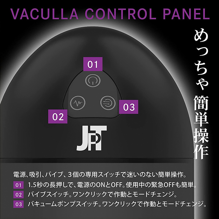・スイッチは3個だけ、迷いのない簡単操作。 電源ON/OFF用スイッチ:1.5秒の長押しでON/OFF バキュームポンプスイッチ:10種類のバキューム動作をコントロール バイブ振動スイッチ:10種類の振動パターンをコントロール (バキュームと振動は同時利用可能です。どちらかのみを選んで楽しむこともできます)