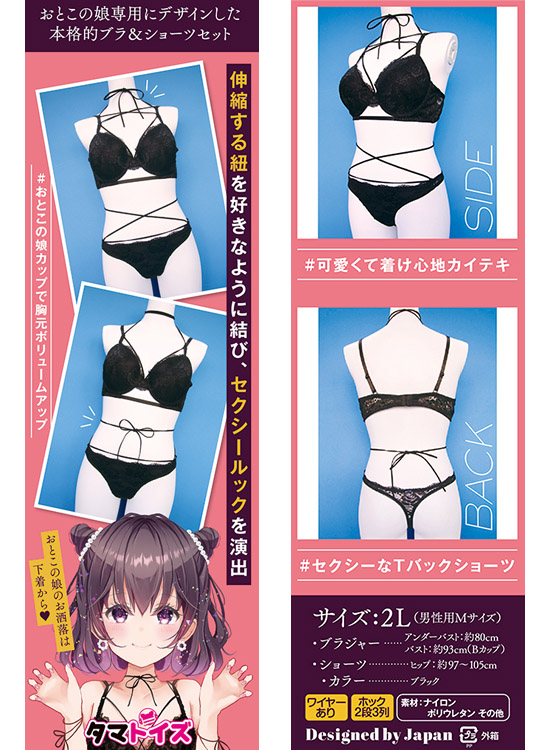 おとこの娘専用にデザインした本格的ブラ&ショーツセット。おとこの娘のお洒落は下着から?ラブリーなイタリアンデザイン☆可愛くて着け心地カイテキ!伸縮する紐を好きなように結び、セクシールックを演出。おとこの娘カップで胸元ボリュームアップ。セクシーなTバックショーツタイプです。サイズ:2L(男性用Mサイズ)【ブラジャー】アンダーバスト:約80cm バスト:約93cm カップ:Bカップ ホック:2段3列 ワイヤーあり【ショーツ】ヒップ:約97〜105cm素材:ナイロン ポリウレタン その他