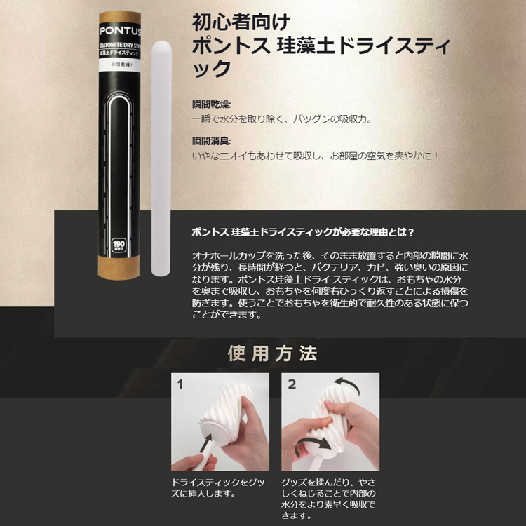 一瞬で水分を取り除く、バツグンの吸収力!オナホールカップを洗った後、そのまま放置すると内部の隙間に水分が残り、長時間が経つと、バクテリア、カビ、強い臭いの原因になります。ポントス珪藻土ドライ スティックは、おもちゃの水分を奥まで吸収し、おもちゃを何度もひっくり返すことによる損傷を防ぎます。使うことでおもちゃを衛生的で耐久性のある状態に保つことができます。日本製本体サイズ:19×Φ1.5cmパッケージサイズ:25×3.3cm