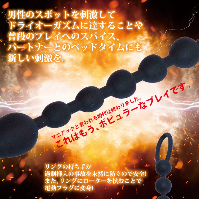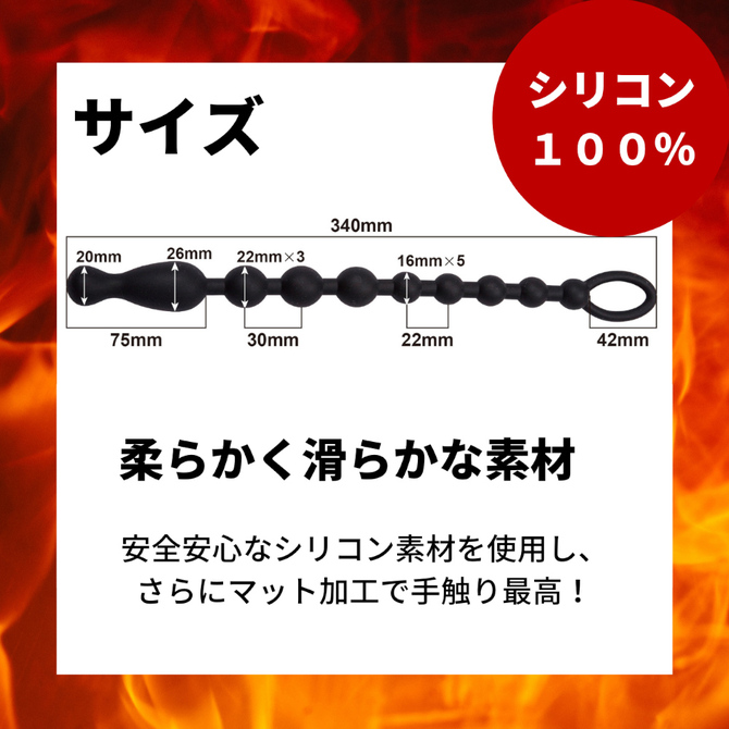 100%ピュアシリコンで作成した、安心安全な、10個のビーズが連なった取っ手付きのアナルビーズです。先端部は直径2cmと2.6cmの一体ビーズ型。続いて直径2.2cmの玉が3連続して、直径1.6cmのビーズが5連続きます。差した状態で、ローターをあてたり、そのまま散歩したりと、想像以上にいろいろシチュエーションでの使用が可能です♪本体サイズ:2.6×34.0×2.6cmパッケージサイズ:5.0×35.0×3.5cm