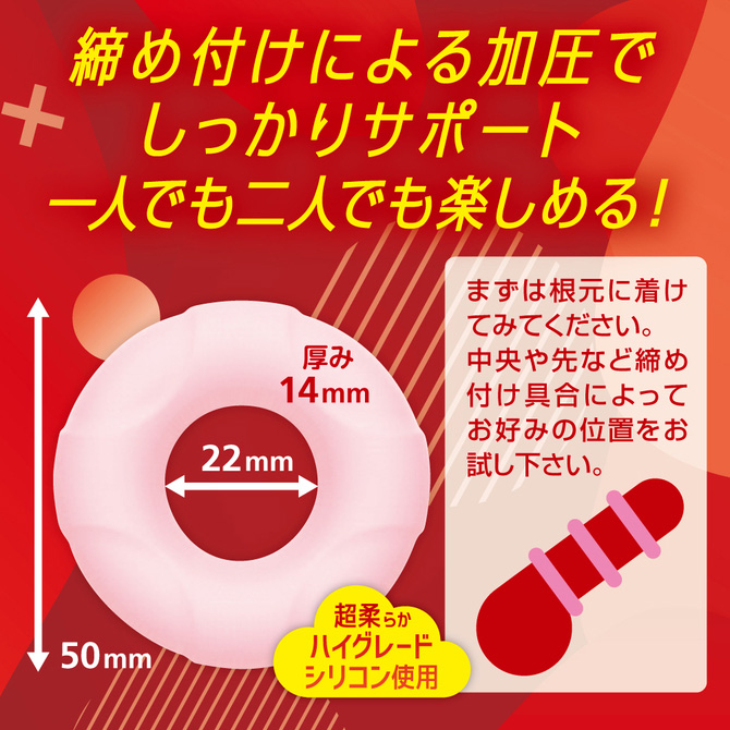 超やわらかシリコンリング☆ミディアムサイズは根元だけではなく中央や先に着けても使用頂けます。一人での使用はもちろんカップルでもお楽しみいただけます♪LARGEサイズとの2個つけでギンギンのガッチガチへ。使用後は中性洗剤等で洗って水を拭き取ったのち直射日光の当たらない場所で乾燥、保管をしてください。パッケージサイズ:11.0×7.0×2.8cm本体サイズ:5.0×5.0×1.4cm 内径2.2cm