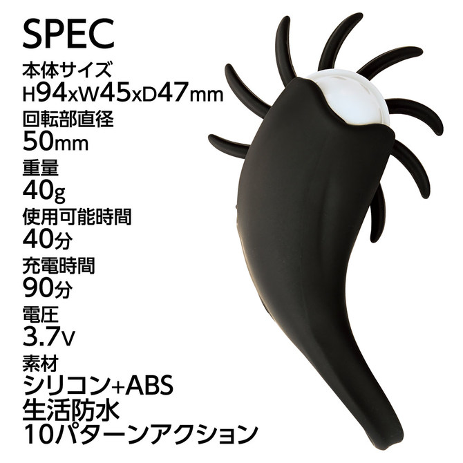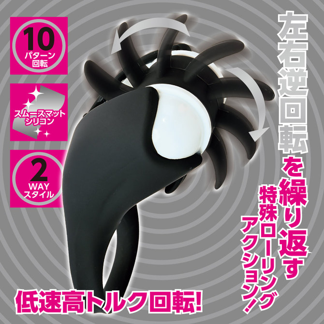 ペロペロしてくれるローターは、い・か・が?左右逆回転を繰り返す特殊ローリングアクション機能のリング登場。よりリアルな低速回転アクションをハイパワーモーターで実現。指にはめたり、リングとして着用してク○や乳首を刺激!リバース回転を繰り返す動きを含む10パターンアクション。リチウムイオン電池搭載で90分で満充電・最大40分使用可能。(※使用環境により大幅に増減します)生活防水性能。リング部は肌触りの良いシリコン素材採用。パッケージサイズ:10×14.6×5cm商品サイズ:9.4×4.5×4.7cm重量:40g付属品:充電ケーブル