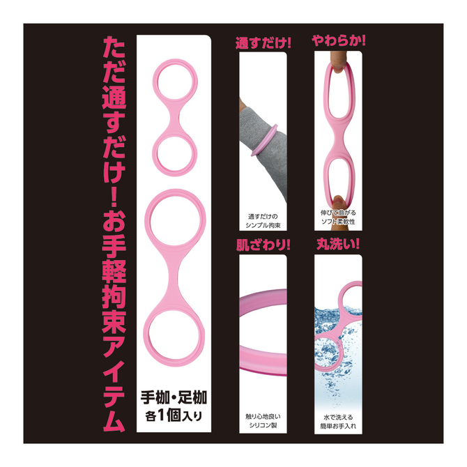 好きなあの子をいいなりに……。 ただ手や足を通すだけでしっかりSMプレイになる、超シンプルな拘束具「SMシリコン手枷&足枷」! SMプレイの核心となる「拘束」を、とってもお手軽にするSMアイテムです。 輪っかの中に、手や足をただ通すだけ。 難しいことが一切無いシリコン枷です。 本体のシリコン素材には柔軟性がありますので、装着感もバツグン。 大きさは、男性でも装着可能なフリーサイズ。 丸洗いもできてメンテナンスも簡単。 見た目シンプルなのでタブー感が薄く、ソフトなSMプレイにぴったりです。 「手枷&足枷」は、手枷と足枷がそれぞれ1個づつのセットです。 手足の自由を奪うことで、行動を制限するSM束縛プレイをお楽しみいただけます。