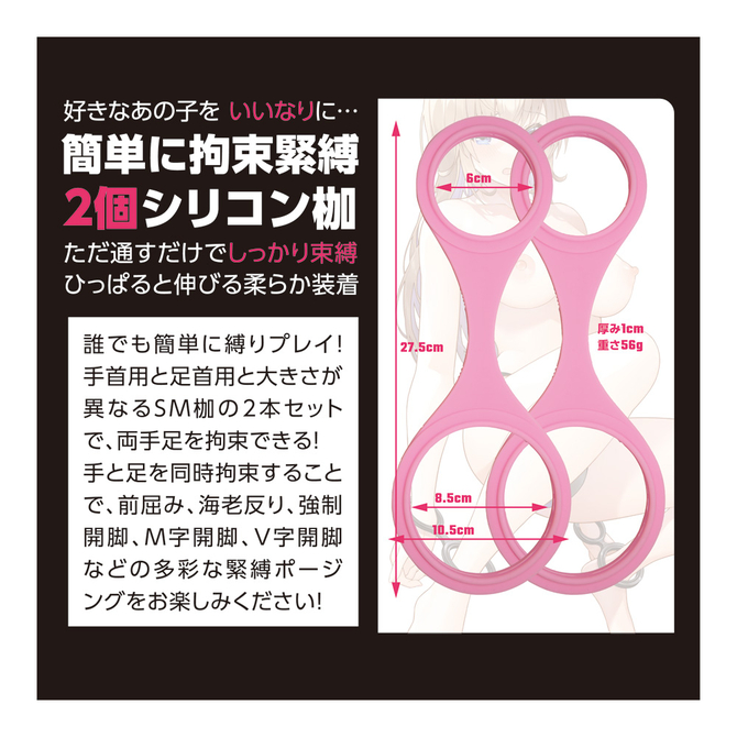 好きなあの子をいいなりに……。 ただ手や足を通すだけでしっかりSMプレイになる、超シンプルな拘束具「SMシリコン手足枷」! SMプレイの核心となる「拘束」を、とってもお手軽にするSMアイテムです。 輪っかの中に、手や足をただ通すだけ。 難しいことが一切無いシリコン枷です。 本体のシリコン素材には柔軟性がありますので、装着感もバツグン。 大きさは、男性でも装着可能なフリーサイズ。 丸洗いもできてメンテナンスも簡単。 見た目シンプルなのでタブー感が薄く、ソフトなSMプレイにぴったりです。 「手足枷」は、片方は手枷、もう片方は足枷となる、 ハーフ&ハーフモデルが2個付いたセットです。 両方の手首と足首を繋げて拘束することができます。手と足を拘束することで、前屈み、海老反り、強制開脚、M字開脚、V字開脚、などなど多彩な緊縛ポージングを演出いただけます。