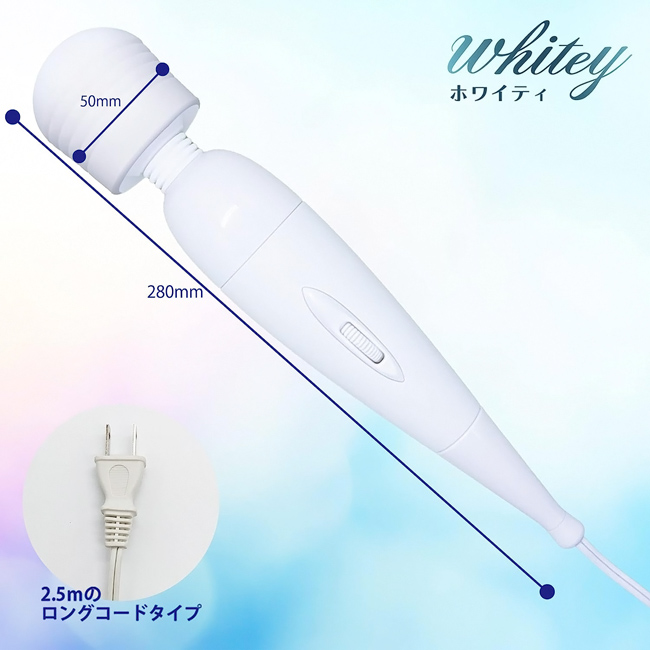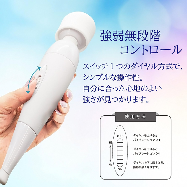 清潔感溢れる白と、すべすべと触り心地のいいシリコンボディ。 無段階コントロールで優しい振動からハイパワー強振動まで、お好きな加減で身体中を癒します。女性が片手でも楽に持ち続けられる軽量設計。