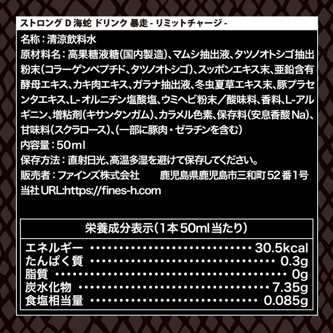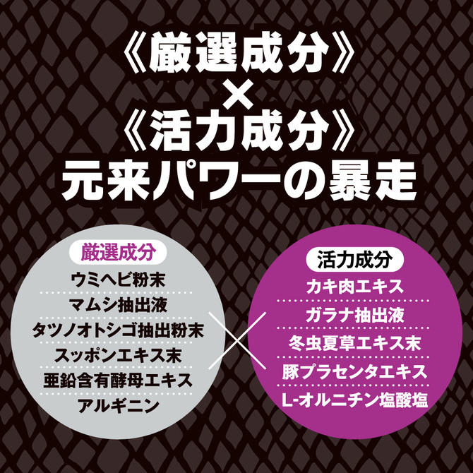 元来パワーの暴走!芯からパワーがみなぎる! 琉球地方古来より、伝統的高級食材として珍重されたエラブウミヘビの圧倒的な滋養力を基に開発された、大人気「ストロングD 海蛇」シリーズから 更に進化した暴走系ドリンクが登場! アミノ酸42種類・ビタミン・ミネラルが豊富なウミヘビ成分&相性の良い厳選成分に「マムシ抽出液、タツノオトシゴ抽出粉末、スッポンエキス末、亜鉛含有酵母エキス、アルギニン」を贅沢に組み合わせて配合。みなぎる活力成分として「カキ肉エキス、ガラナ抽出液、冬虫夏草エキス末、豚プラセンタエキス、L-オルニチン塩酸塩」を更に組み合わせ。いきり立ちたい夜の即戦力にぜひ!