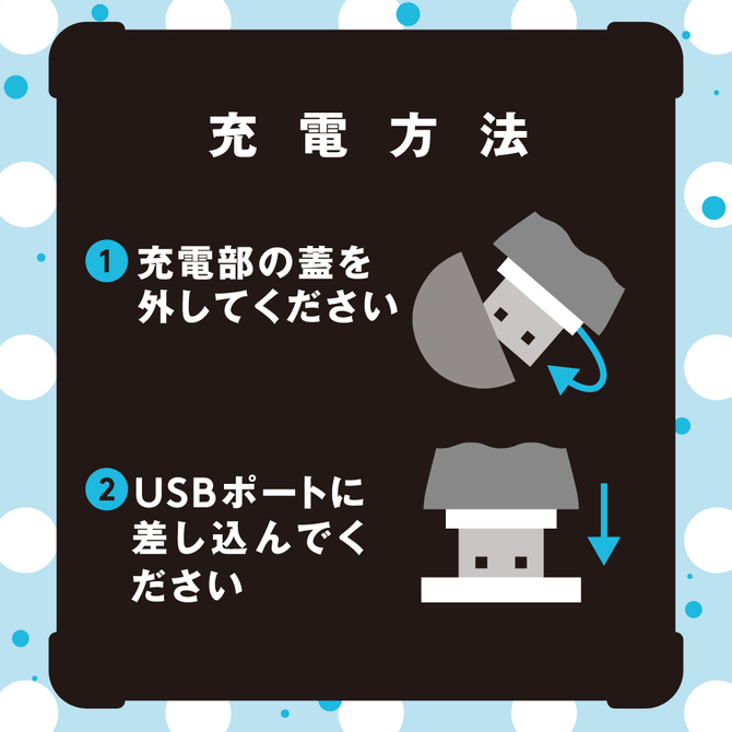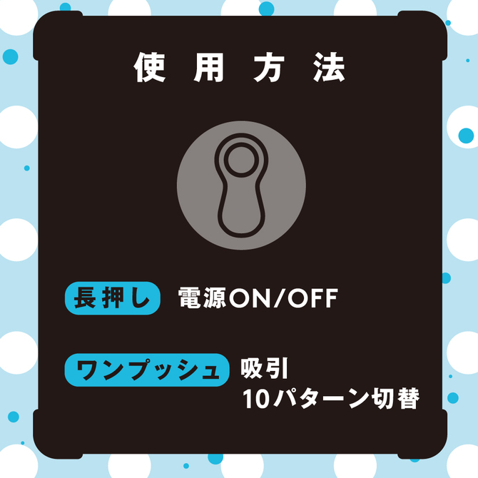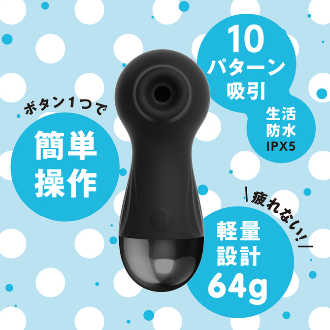 「はじめて」の人に選んでほしい。コンパクトボディでもしっかりイケる、強力吸引10パターン。手が疲れにくい軽量設計64g。ボタン一つで簡単操作。USBポートに差し込むだけのラクラク充電。お手入れしやすい生活防水IPX5。