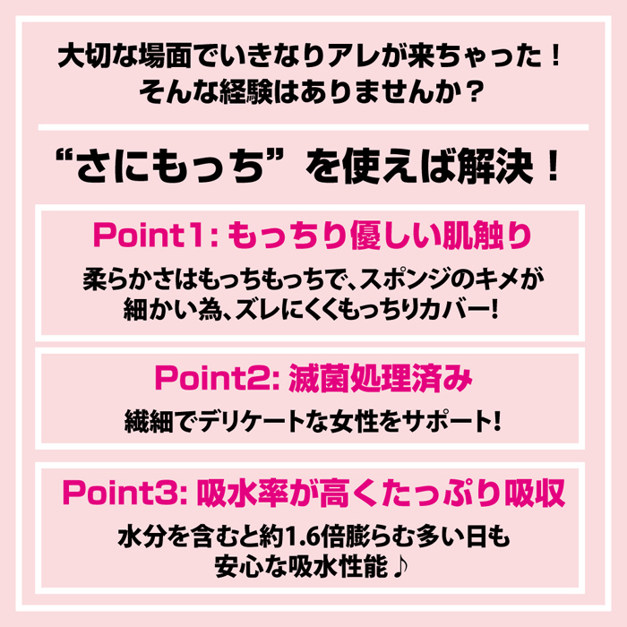もっちり新素材のサニタリー商品柔らかくもっちりとした感触の新素材。 吸水性が抜群で、水を含むと約1.6倍膨らみます。 さにもっちの柔らかさはもっちもっちで、スポンジのキメが細かい為、ズレにくくもっちりカバー。 繊細でデリケートな女性をサポート。・もっちり優しい肌触り ・滅菌処理済み ・吸水率が高くたっぷり吸収 5個セット 材質:ポリウレタン(親水性) ※食べ物ではないので口に入れないでください。 1点あたりのパッケージサイズ 横約4.5cm 縦約7.5cm 高さ2.5cm 重さ1g