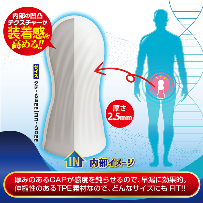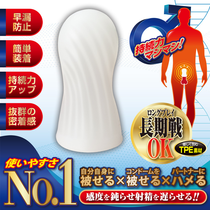 男の強いミカタ。夜のお助けサポートアイテム ! !厚みのあるキャップが感度を鈍らせ、持続力マシマシで長期戦もOK。装着方法も簡単。キャップを自身に被せ、その上からコンドームを装着するだけ。フィット感も抜群で、どんなサイズにも対応。いつもより長く楽しみたい方におススメのお手頃キャップです。●TPE素材…伸縮性抜群で、どんなサイズでもぴったりフィットパッケージサイズ(cm):H14.0×W9.0×D0.6本体サイズ(cm):縦6.5/横3.0重量:本体9g / 総重量17g