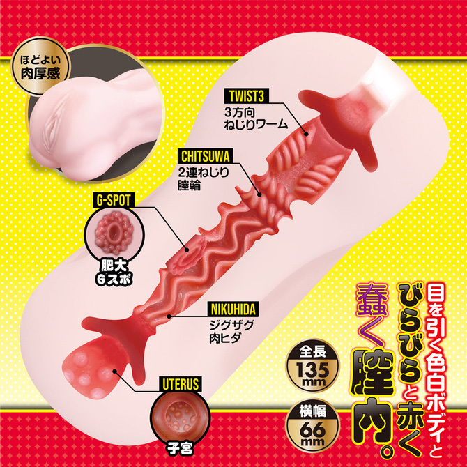 未熟な見た目と、早熟した膣内と。目を引く色白ボディとびらびらと赤く蠢く膣内。ねじれた2連の膣輪とジグザグとした肉ヒダがメリメリと亀頭・カリ・竿全体にねっとりと纏わりついてくる…。未熟な見た目とは裏腹に、肉ヒダの波にすっぽりと飲み込み、アナタを弄ぶ。・非貫通・ローション付属パッケージサイズ(cm):H17.0×W9.0×D6.5本体サイズ(cm):全長13.5mm/横幅6.6mm重量:本体300g / 総重量345g
