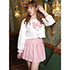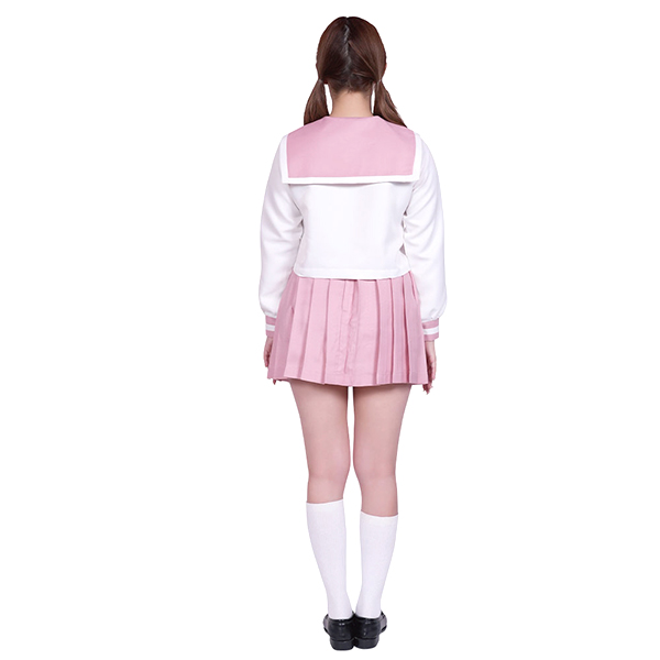 マカロン「桜」風味をイメージした新生活ハッピー制服。流行を取り入れた淡いピンクと裾の切り返しがワンポイントになっているのがお洒落ポイント♪サイズ:着丈45cm/肩幅40cm/袖丈56cm/バスト75〜85cm/ウエスト65cm/スカート丈38cmセット内容:長袖セーラー服、スカート、リボンタイ