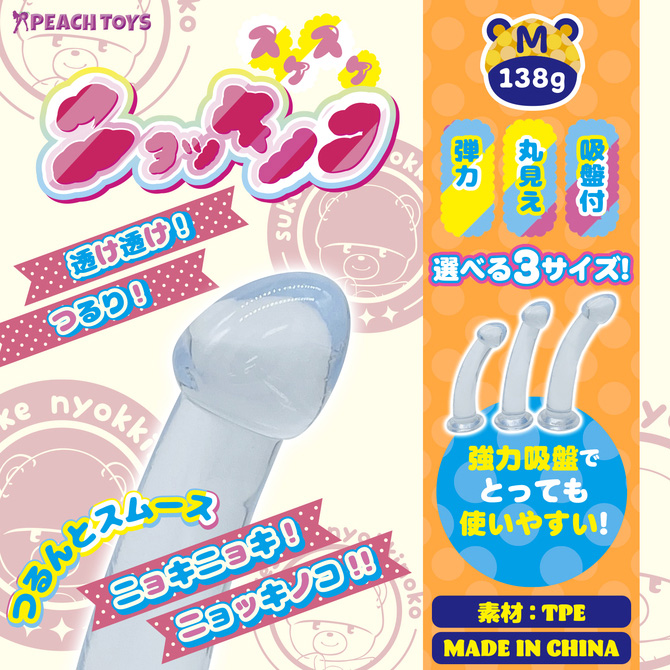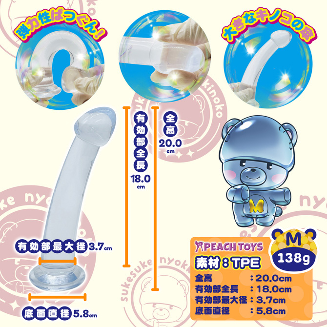 『透け透け!スケスケ!ニョッキニョキ!ニョッキノコ!』つるんとスムース♪クリア素材のディルド!!「スケスケニョッキノコ」ディルドの登場です! ニョキニョキっとMサイズ☆☆ 平均サイズよりやや大き目。長さも十分!少し大き目がちょどいい♪全高:20.0cm 有効部全長:18.0cm 有効部最大径:3.7cm 底面直径:5.8cmパッケージサイズ:26.0×16.0×8.0cm