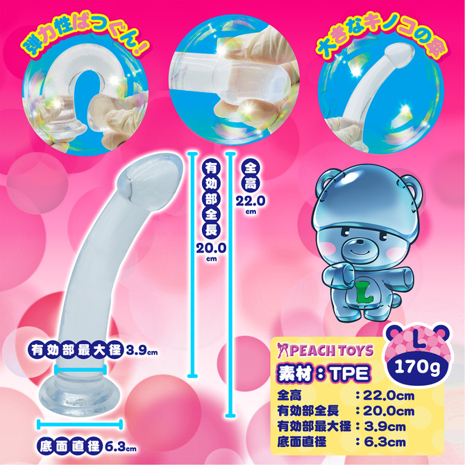 『透け透け!スケスケ!ニョッキニョキ!ニョッキノコ!』つるんとスムース♪クリア素材のディルド!!「スケスケニョッキノコ」ディルドの登場です!ニョキニョキニョキっとLサイズ☆ ☆☆大き目で長めの大満足サイズ!全高:22.0cm 有効部全長:20.0cm有効部最大径:3.9cm 底面直径:6.3cmパッケージサイズ:26.0×16.0×8.0cm