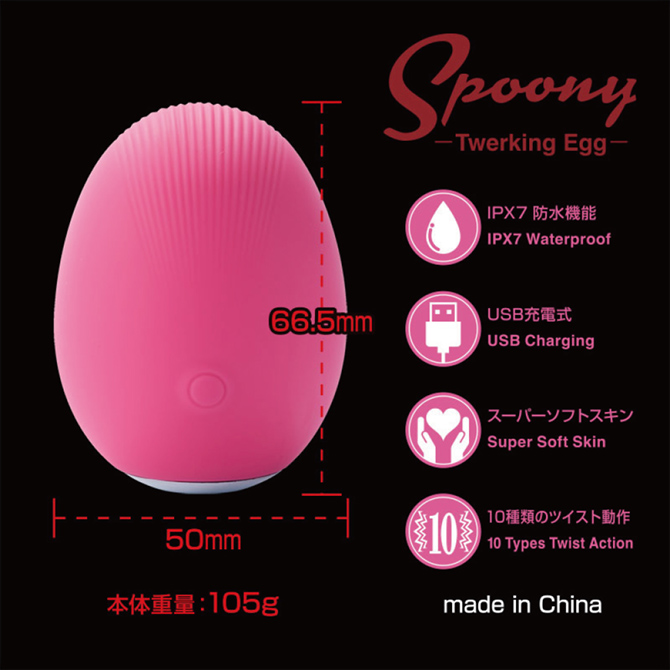 このスプーニー トワーキングエッグはとても柔らかな肌触り。 まるでマシュマロの様な滑らかさが自慢です。 また振動は珍しい左右ツイスト振動。 優しく、心地よいツイスト振動があなたを揺らします。 操作は簡単。まず電源スイッチを長押しで起動。 起動後は短押しで10種類の振動パターンを楽しむことが可能です。 およそ55分の充電で、最大25分の使用が可能です。 女性への優しさが詰まったスプーニー トワーキングエッグ。ゆらゆらと揺れる様な振動をお楽しみください。