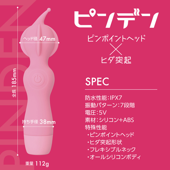 ピンポイントヘッド・ヒダ突起付の完全防水シリコンデンマです。上質振動の強力モーター搭載・高品質シリコンボディ・フレキシブルネックの上級性能に加えてピンポイントを強力刺激出来る先端突起と割れ目に入れて楽しめるヒダ突起形状をプラスしました。強弱微調整可能な7段階振動です。90分満充電で60分使用可能(※使用環境により大幅に増減します)なリチウムイオン電池内蔵。パワフルなのに繊細な使い方も楽しめるデンマです。全長:18.5cm 持ち手径:3.8cm ヘッド径:4.7cmパッケージサイズ:H21.9+ヘッダー4.0xW9.2xD5.3cm