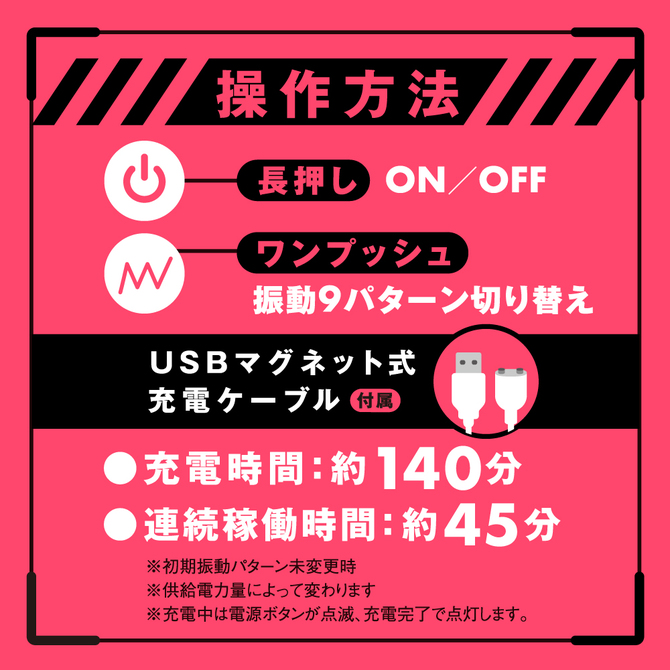サオに巻きつけて激震センズリ!9パターン振動の最強ハイパワーローター搭載!サイズ調整可能なベルトデザインなので、どんなサイズでもぷにっとフィット!サオや根元に巻きつけてご使用ください。オナホールや手コキとの併用にもオススメです!9パターン振動&充電用USBケーブル付属&軽量設計57g。充電時間:約140分。連続可動時間約45分。検査番号:2302227パッケージサイズ:16.8×12×6cm本体サイズ:12×6.4×3.2cm重量:57g付属品:USB充電ケーブル