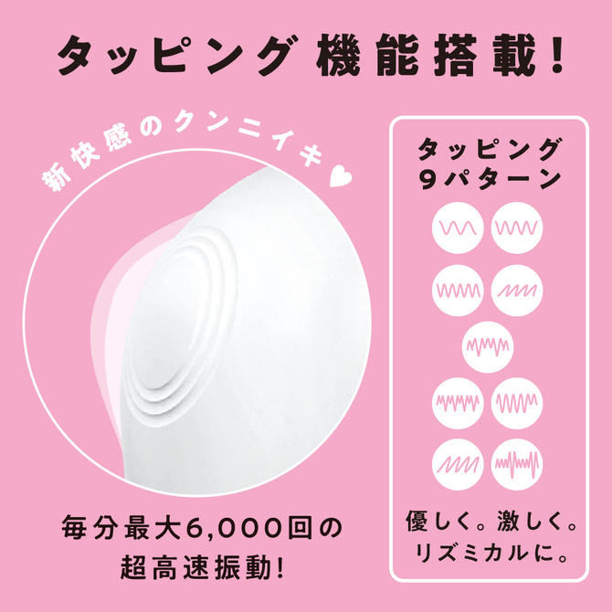 前戯革命!新快感のタッピング機能搭載!タッピンクンニローターで性の革命を起こそう★毎分最大6000回の超高速タッピングでクリイキ絶頂!様々な女性の好みに合わせたタッピング9パターン。高品質ソフトシリコンを使用しているので、さらさら、ふわふわの優しい人肌感触です。使いやすい手のひらサイズ。ラクラク操作のワンプッシュ式。完全防水 IPX7等級。静音設計 ≦53dB。充電用USBケーブル付属。検査番号:2302498パッケージサイズ:16×9×6cm本体サイズ:12×4.7×4.7cm重量:108g付属品:USB充電ケーブル