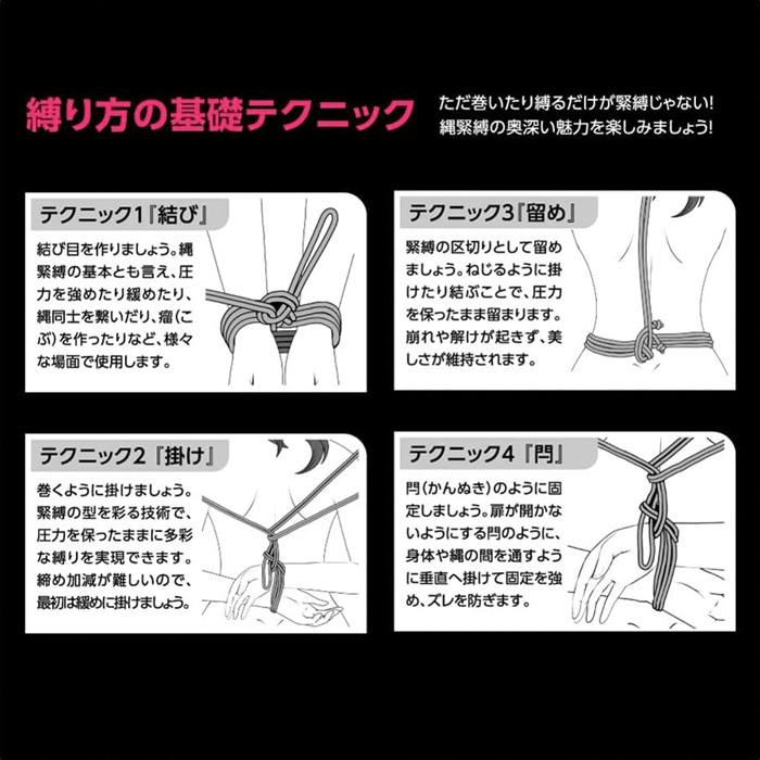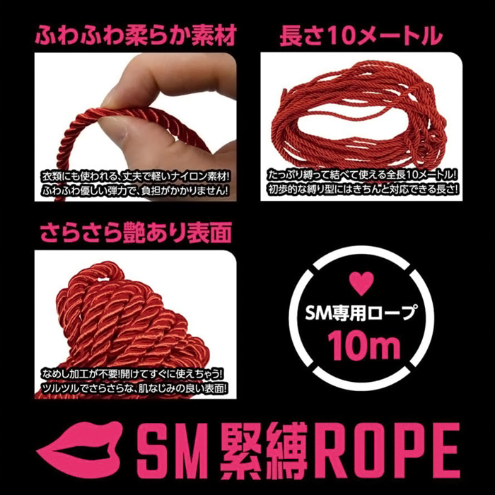 好きなあの子をいいなりに……。 SMプレイの憧れとも言える縄緊縛が楽しめる、SM専用ロープ「SM緊縛ROPE」RED! SMプレイの華、「緊縛」を気軽に始められるSMアイテムです。 柔らかいナイロン素材を使ったロープですので、初心者の方でもOK! 柔らかさが弾力となり痛みになりづらく、表面もツルツルで肌なじみバツグン。 速乾性もあるので洗いやすくお手入れも簡単。 長さは贅沢に使える全長10メートル。 太さは取り回しやすい直径6ミリ。 表面には高級感のあるしっとりとした光沢仕様。 手首などの基本的な縛りはもちろん、椅子や家具などに縛り付けて固定緊縛も。 さらには後手縛り、手上げ縛り、胡座縛り、屈脚固定縛りなどの 本格的緊縛術にもチャレンジ!