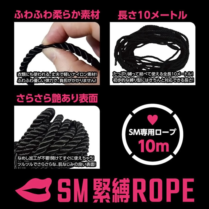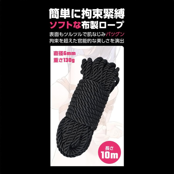 好きなあの子をいいなりに……。 SMプレイの憧れとも言える縄緊縛が楽しめる、SM専用ロープ「SM緊縛ROPE」BLACK! SMプレイの華、「緊縛」を気軽に始められるSMアイテムです。 柔らかいナイロン素材を使ったロープですので、初心者の方でもOK! 柔らかさが弾力となり痛みになりづらく、表面もツルツルで肌なじみバツグン。 速乾性もあるので洗いやすくお手入れも簡単。 長さは贅沢に使える全長10メートル。 太さは取り回しやすい直径6ミリ。 表面には高級感のあるしっとりとした光沢仕様。 手首などの基本的な縛りはもちろん、椅子や家具などに縛り付けて固定緊縛も。 さらには後手縛り、手上げ縛り、胡座縛り、屈脚固定縛りなどの 本格的緊縛術にもチャレンジ!