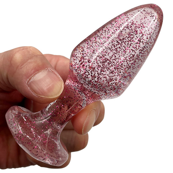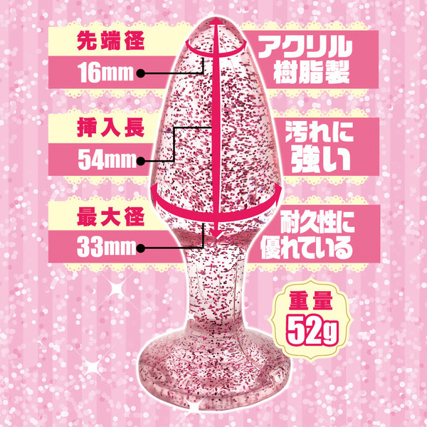 ラメ入りがとってもキュート♪「ラメ入りア●ルプラグLサイズ」! 気分はまるでパーティー♪ 透明ボディの中には、キラキラのラメがみっちり入りました。 眺めているだけで楽しくなる可愛いアイテムです。 本体素材には、魅力を高めるアクリル樹脂を使用しています。 アクリル樹脂は、ガラスのような透明さをもちながらも、優れた耐衝撃性で割れにくいのが特徴です。 耐水性もあるので、水や汚れに強く、メンテンナスの簡単さもポイント。 さらには、カチカチの高硬度タイプ。 柔らかいア●ルプラグには無い、自己主張の激しい刺激にきっと魅了されるはず。 キュートな見た目とは裏腹に、ハードなア●ルプレイをお楽しみください。 「Lサイズ」は、全長110ミリに太さ39ミリのビッグサイズ。ア●ルプレイに慣れた方や、ハードな刺激を楽しみたい方などにオススメです。