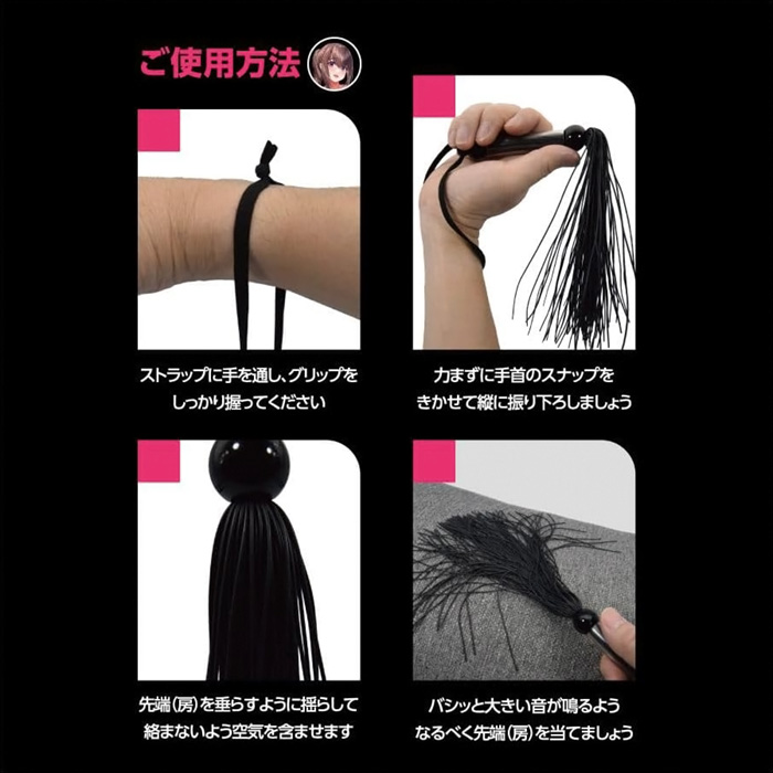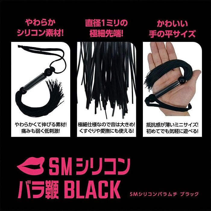 SMプレイの代名詞、SM専用バラ鞭「SMシリコンバラ鞭」! ビシッバシッと叩く音が響き渡る、 SMプレイでは欠かせない「鞭責め」をお手軽に始められるSMアイテムです。 細さ1ミリの柔らかいシリコン素材を束ねた黒い鞭ですので、 重さも軽く、初心者の方でも簡単に取り回しできます! 柔らかさがクッションとなり痛みになりづらいのですが、 バラけた鞭先からは大きい音が鳴り、鞭責めの興奮を強く煽るはず。 シリコン特有のサラリとした肌触りなので、不快感もありません。 全長260ミリ(ストラップ含まず)とやや小ぶりサイズなので、 軽い気持ちで手に取れまず。 遊びのつもりでビシバシしていると、いつの間にか鞭責めの魅力に惹かれてしまうかも!