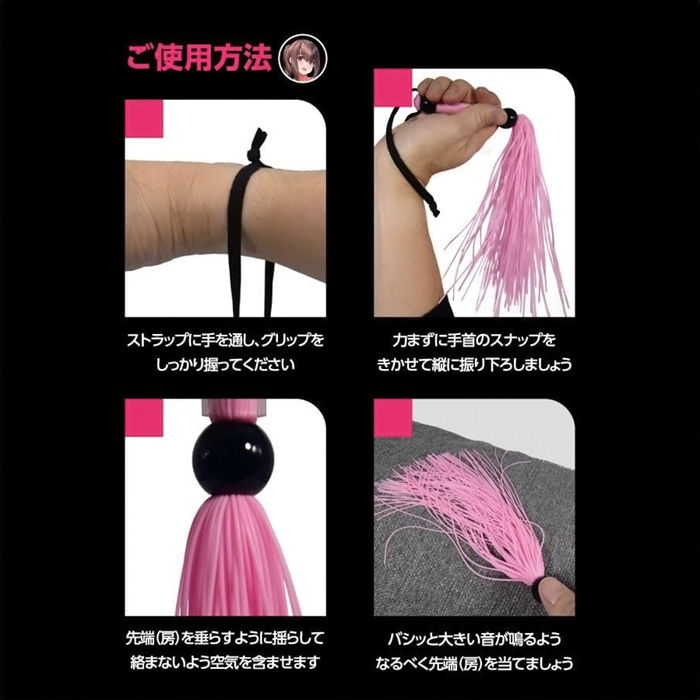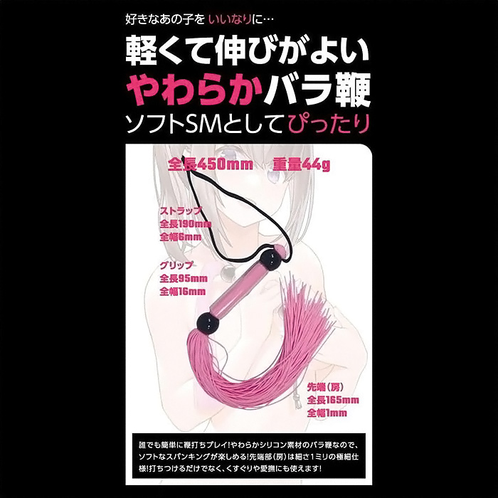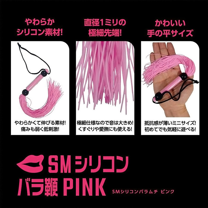 SMプレイの代名詞、SM専用バラ鞭「SMシリコンバラ鞭」! ビシッバシッと叩く音が響き渡る、 SMプレイでは欠かせない「鞭責め」をお手軽に始められるSMアイテムです。 細さ1ミリの柔らかいシリコン素材を束ねたピンクの鞭ですので、 重さも軽く、初心者の方でも簡単に取り回しできます! 柔らかさがクッションとなり痛みになりづらいのですが、 バラけた鞭先からは大きい音が鳴り、鞭責めの興奮を強く煽るはず。 シリコン特有のサラリとした肌触りなので、不快感もありません。 全長260ミリ(ストラップ含まず)とやや小ぶりサイズなので、 軽い気持ちで手に取れまず。 遊びのつもりでビシバシしていると、いつの間にか鞭責めの魅力に惹かれてしまうかも!