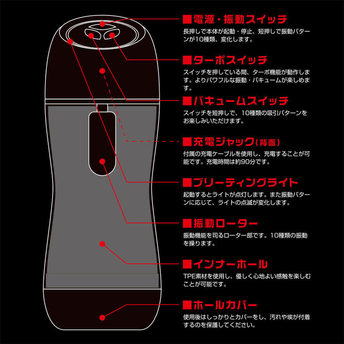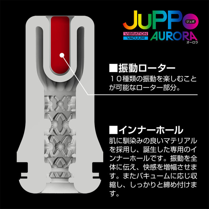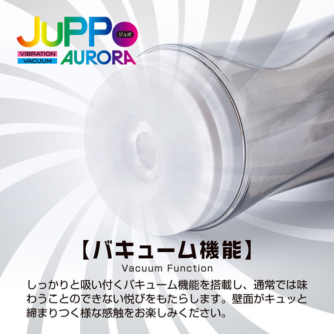 強力な吸引と振動で大人気のJuPPoが送り出す新たな官能のカタチ。 JuPPo AURORAはターボ機能が加わり、より一層の密着感と振動感をお楽しみいただけます。 簡単な操作でリアルを超えたプレイをお楽しみください。 本体は簡単に分離が可能なので、使用後は速やかにインナーホールを外し洗浄が可能です。 充電は本体背面にある充電ポートに付属のUSBケーブルを挿してください。 振動と吸引で導く、新たな官能体験。ぜひ、ご堪能ください。