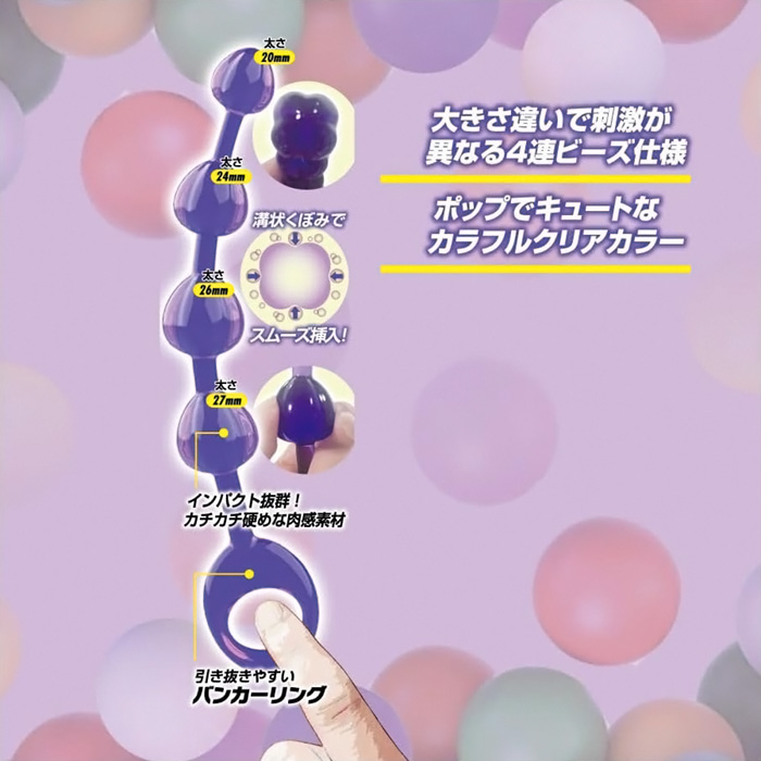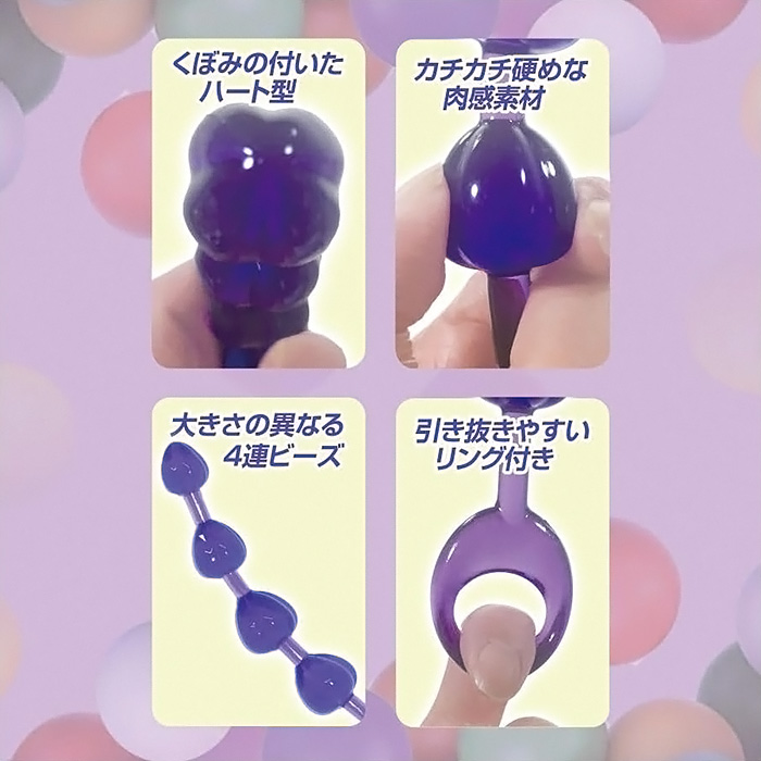 ポップでキュートなミニサイズのアナルビーズが新登場! かわいいハート形状が、大きさ順に4つ連なるアナルビーズです。 先端から20ミリ、24ミリ、26ミリ、27ミリと 奥に行くほど太くなるので、快感のステップを楽しめます。 さらに、本体形状として縦縞くぼみがあり、空気や液体の通り道となり挿入心地をサポート。 最奥部は引っ張りやすい輪っか付き。 ビギナーの方にもぴったりな4連モデルで、 スケルトンでカラフルなボディカラーが精神的な抵抗感を低減させます。 本体素材には、カチカチ硬めなエラストマー素材で、インパクトのある肉感を再現しました。 この硬さが、強い存在感を放ちます。あなたを夢中にさせる快感素材と、 ビギナーにもオススメできるベーシックな型状で、狙いを外さない鉄板のアナルビーズです。