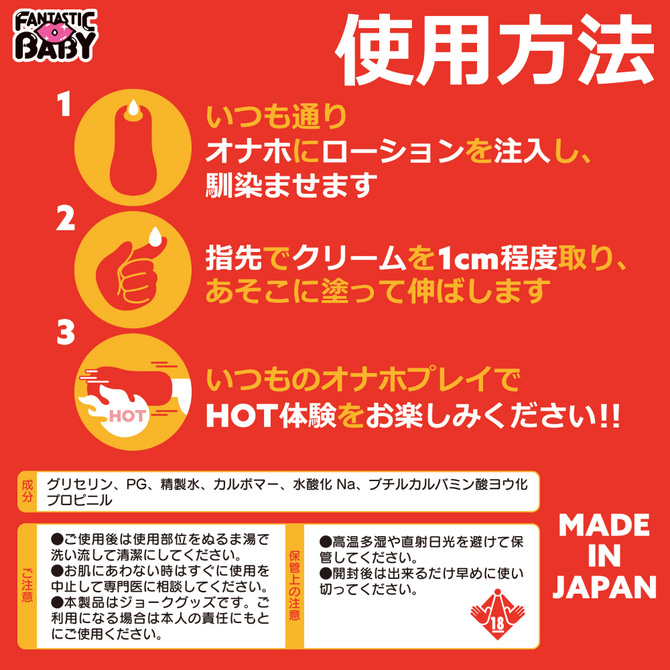 オナホールの一人エッチをもっと快適に☆ いま衝撃のホカホカ体験がはじまる…! ・アソコにぬるだけ3秒でHOT ・オナホはいつものローションでそのままプレイOK ・これで異次元のオナホ体験がはじまります ・まるで生本番のような感動がそこに オナホを使用した時の「ヒヤッ」とした感触。苦手な方は意外と多いとFANTASTICBABYは考えました。 少なくとも開発担当は「ヒヤッ」が我慢ならなかったのです。 温感ローションを使ったりもしましたが「温かい」まで届かず。 かと言って事前にオナホを温めておくのも面倒…。 そこで発想を逆転させたのです。 温めるのはオナホでもローションでもなくアソコだ!と。 たったこれだけであんなに悩んだオナホLIFEに光が差しました。温かいは偉大、HOTisオナホ、今日から「ヒヤッ」にさようならです。100g入りでコスパも超抜群!何十回でもHOTになってくださいね。