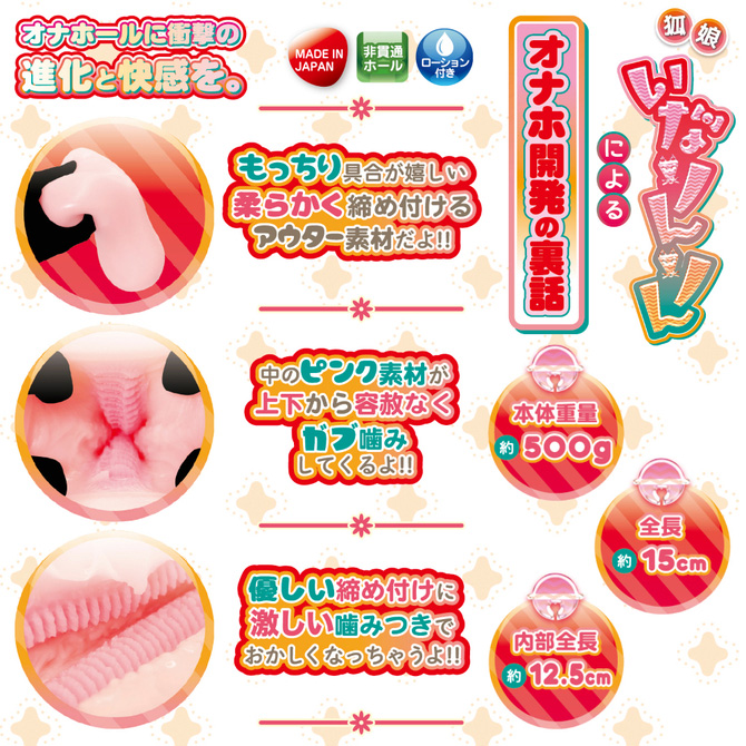 狐幼女のガブガブマ●コを体験しよう♪ 仙女には至らない未熟な狐三姉妹の末っ子「いなりんりん」が刺客としてやってきた♪ 「ガブ噛み妖技!!もちっとカミリー」ガブ噛みというだけあって、噛まれる感覚が斬新な一品! 噛まれると言ってもそこは性的な情緒に溢れた仕上がりとなっており、つまりは次のようなコトである。 1、もっちりとしたアウターにぬぷぬぷと吸い込まれる。 2、もっちりアウターがゆっくりと締め付け絡んでくる。 3、インナーの上下にハード素材のジョリ突起がある。 この1〜3を組み合わせる事で斬新すぎる「ガブ噛み」体験が出来るのである。 いなりんりんが自信満々に言ってくる。「キミのアソコをカミリーしちゃうよっ」。