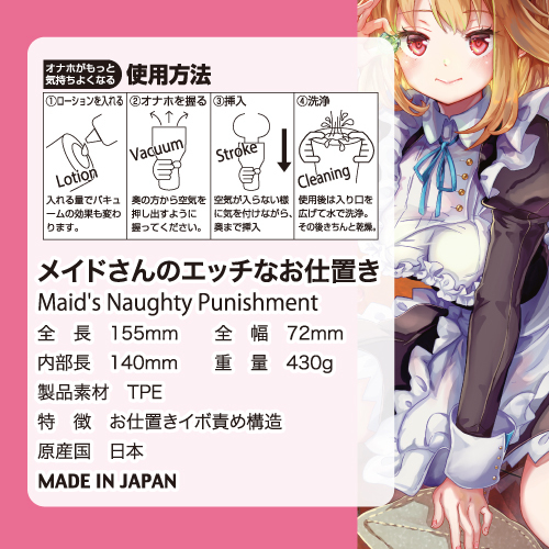 このメイドさん、実は凄腕?!ストロークに合せて、上へ下へ絡みつく!きつきつムぎゅムぎゅぶりんぶりんの内部構造に、即発射!「今夜もご主人様のお部屋にいきますからね!」特徴:お仕置きイボ責め構造厚生労働省:食品衛生法基準第370号準拠素材採用パッケージサイズ:15.5×21×8cm商品サイズ:15.5(内部長14)×7.2cm重量:430g付属品:ローション(おなつゆスティック)12mL