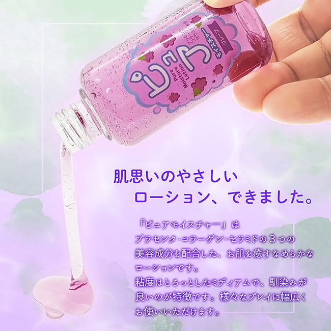 肌にやさしく透き通る純真ローション、「ピュア モイスチャ―」プラセンタ・コラーゲン・セラミドの3つの美容成分を配合した、お肌を癒すなめらかな使い心地のローションです。ローションに潤い成分を配合することで、プレイ中の擦れによる肌のヒリヒリ感や、ちょっとしたツンとする違和感を緩和する効果が期待されています。粘度は、幅広くお使いいただけるミディアム。バリエーション豊かなラインナップから、気分や好みに合わせてお気に入りのフレーバーを見つけてみてはいかがでしょうか?