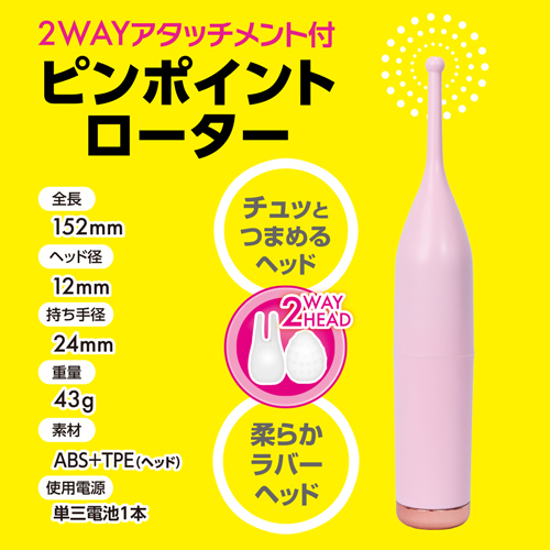 先端シリコンヘッドが丁度良い部分を絶妙振動で刺激します。 シリコンヘッドはポイントヘッドとチュッとつまめる二又ヘッドの2WAY使用が可能です。 軽量ボディだから使用感もバツグン!とにかくお手軽で使いやすいスティックローター。商品サイズ:H15.2×最大径2.4cm総重量:95g本体重量:43g 付属品:単三電池1本