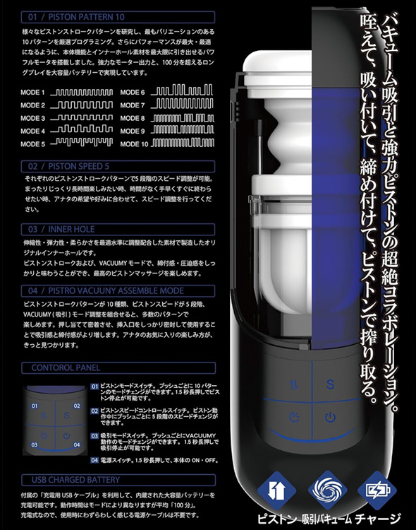 10種類のピストンパターンと5段階のスピード操作、7種類のバキュームパターンで自分に合った変化を楽しめます。